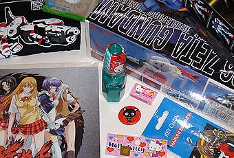 Un tshirt Neko Wear (soldé), un porte clef Haruhi Suzumiya (sur le stand de Kaze), un nouveau gunpla, (un MG MSZ 006 Zta Gundam que je vais stocker car j’en ai dejà un en cours…), une tirelire Money Pet (en peluche toute mignonne), deux gundams au 1/144 (remporté lors du concours organisé par Hobby Forever), quelques petits goodies/bonbons hello kitty, chococat (pour ma femme…), et un tapis de souris Ikki Tousen (pour monsieur…).