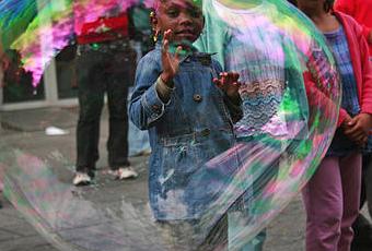 Il s'appelle Tomek et fait d'énormes bulles, juste avec 2 manches à balai et des lanières de tissu...