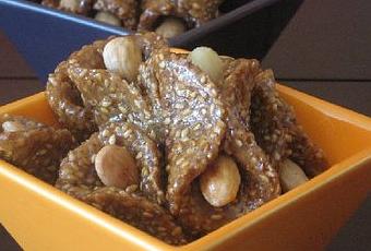 Plonger les babouches dans l'huile en commençant par la partie pincée. Les retourner pour finir la cuisson, une fois dorées, les tremper dans le miel Les égoutter dans une passoire, encore tièdes les prendre et disposer deux amandes à l'intérieur de chaque côté.