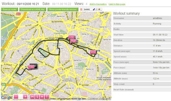 Après avoir vu le système Adidas miCoach couplé au téléphone portable Samsung, voici le logiciel de suivi sportif par GPS remis au goût du jour, le Nokia Sports Tracker. Proposée depuis 2007 par Nokia, l’application Nokia Sports Tracker reprend aujourd’hui tout son sens vu le nombre de téléphones portables Nokia équipés d’un GPS. Que vous soyez en vélo, en ski, rando ou course à pied, ce logiciel vous permet d’obtenir des données comme la distance, la vitesse, l’altitude, la durée de votre sortie et certainement le point le plus intéressant, l’exportation de votre parcours sur Google Earth. Ci-dessous vous pourrez voir le parcours réalisé à travers Paris qui reste très précis et indique les zones d’allures faibles ou rapides