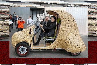 une voiturette dont la carrosserie est en bambou.