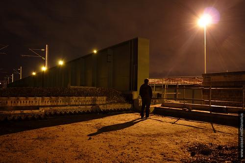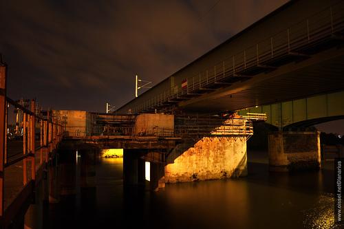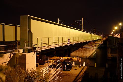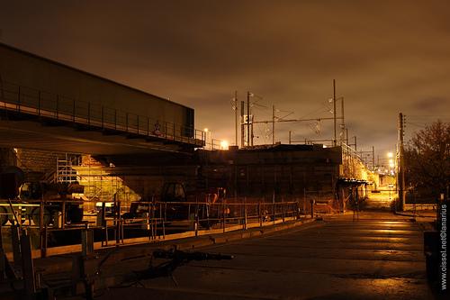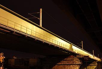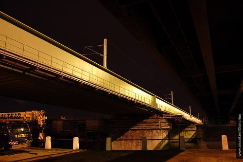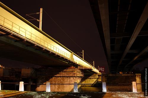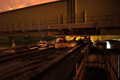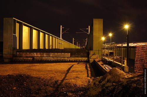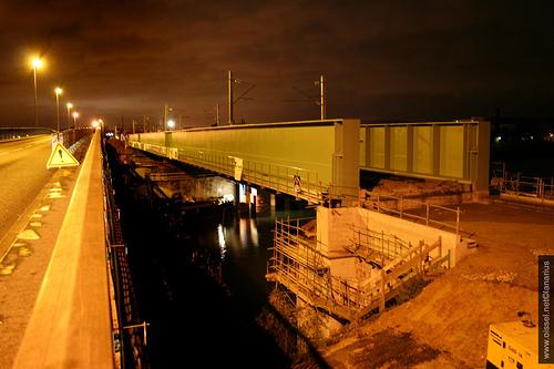 21h50 Gloups :\ ! Chantier désert, lumières éteintes et... pont en place ! La scène est si-dé-ran-te ; En début de soirée, le tablier métallique n'était encore qu'à mi-parcours... Ils auront donc réussi, en moins de 6 heures et avec une journée d'avance, à 'glisser' les 185 mètres du nouveau viaduc.