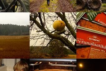 Traktoriajelu Vaarin kanssa metsään viimeöisen myrskyn jälkiä tutkailemaan oli huimempi kuin mikään karusellikyyti ja metsässä tavattiin uskomattomia rinteitä kipuava ja puita rohmuava ajokone (wikipedian mukaan myös hakkuukone). Pellontakaa näkyi tila ihan toisesta vinkkellistä, ja ihmeteltiin myös lähdettä josta tulee hanavesi - se maailman paras juoma.