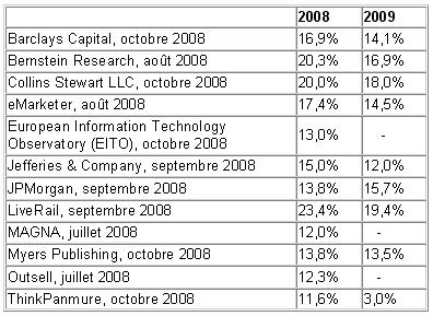 Une étude récente des prévisions de dépenses comparées dans le secteur de la publicité en ligne pour 2009, compilée par eMarketer aux États-Unis, renforce ce point de vue en montrant que la plupart des études prévoient encore en 2009 une croissance d’environ 15 % dans le domaine de la publicité en ligne, la croissance moyenne se situant à 10 %, et ce même lorsque les scénarios les plus noirs sont envisagés.