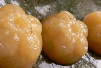 A des morceaux de poires rapidement cuits et grossièrement écrasés pour garder de la texture, est ajouté de l'agar agar (environ 2 cuil à café pour 8 poires, ne pas hésiter pour être sûr d'avoir une texture bien ferme) et une pointe de badiane en poudre.
