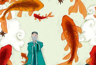 « Monsieur Pan mourait un peu chaque jour. Il habitait près des remparts de la ville, dans une petite maison au portail de laque rouge, dont la porte était ornée de carreaux émaillés, bleus comme une eau peu profonde, à motifs de roseaux et de feuilles de riz. Dans le jardin, un bosquet de bambous vert pâle poussait à côté d'un bananier vert sombre. Un joli bassin à poisseaux rouges s'étendait à l'ombre des bambous, un bassin bordé de carreaux vert clair décorées de fleurs de pêcher et arborant les six idéogrammes d'un vieux poème :