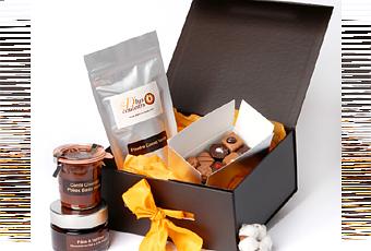 Folie gourmande,avec une boite de 250g de chocolats, 250g de poudre de cacao-vanille, 100g de thé chocolat-menthe, 200g de sucre roux vanillé, 275g de confiture crème caramel au chocolat noir, 140g de confit chocolat-poires-baies roses, un bâton de vanille de Madagascar et une fleur de coton, présentés dans une boite raffinée à rabat aimanté au prix de 60 € TTC.