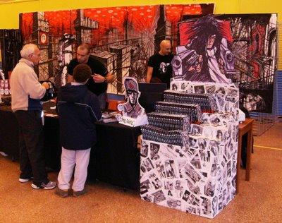 Tito (en photo ci-contre) a ouvert son blog et attend les commentaires avec impatience. N’hésitez pas, le site est très vivant et recèle de petites merveilles. Il a commencé l’écriture du prochain épisode de Tendre Banlieue. Philippe Bonifay prépare chez Dupuis un nouveau triptyque sur la piraterie, cela devrait s’appeler Brigands de mer. Sur ce créneau, vont sortir d’ici 2010 des projets de Franck Bonnet avec Marc Bourgne (les pirates de Barataria) et de Jérémy avec Jean Dufaux (Barracuda). De son côté, Jean-Charles Kraehn va poursuivre seul la destinée de la série Gil-St-André, Sylvain Vallée étant trop engagé dans la nouvelle série Il était une fois en France.Tout autour étaient dressés des stands ainsi que plusieurs expositions. Sur la scène en hauteur étaient disposées les planches rétrospectives d’Eric Chabbert, invité d’honneur de cette septième édition. Les commentaires et explications sur l’auteur étaient tirées de mon interview parue sur Auracan.com.