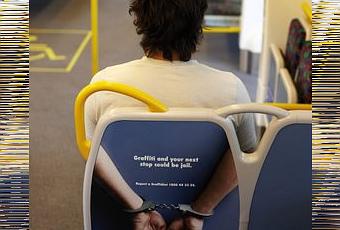 J'aime beaucoup l'idée d'exploiter les sièges d'autobus pour faire campagne... Ici une publicité dans les transports publics de la ville de «Perth - Australie» pour sensibiliser au fait que le graffiti est maintenant passible de peine d'emprisonnement. On peut y lire «Graffiti and your next stop could be jail». Agence: Cooch Creative