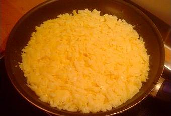 Cuire le premier côté pendant environ 10 minutes. Appuyer à nouveau pour former une galette plus compacte et répartir le deuxième tiers de la matière grasse sur tout le pourtour de la poêle.