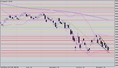 On peut toutefois se raccrocher à la structure en biseau matérialisée sur le graphe. Une rupture par le haut de l'oblique supérieure pourrait donner naissance à un nouveau signal haussier sans doute après s'être rapproché du niveau des 3000 points.