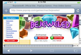 Un peu comme pour la Wii, o첍 un nombre important de jeux flash sont disponible via le navigateur web, c'est PopCap Games qui vient d'annoncer avoir adapté son jeu Bejeweled pour l'iPhone. Il suffit de se rendre à cette adresse pour en profiter. Il est fort probable que ce type d'application via le net arrive de plus en plus pour le téléphone d'Apple, et ce n'est pas une révolution même si certains veulent le faire croire... via iTrafik ipod%20video">