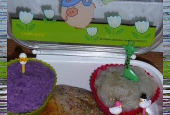 Cette fois-ci, c’est un bento tout en couleur, composé de trois purées différentes.