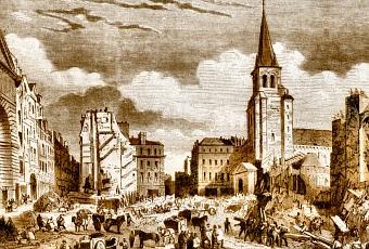 L'église Saint-Germain-des-Prés, à gauche le portail de l'entrée de la Cour du Dragon ......... Comme pour le percement du boulevard de Magenta, l'ouverture de la rue de Rennes se fit en deux temps. Le premièr c'est en 1853, puis c'est en 1866, après l'éventrement de grand nombre de petites rues, le deuxième tronçon qui aboutit à l'actuelle boulevard Saint Germain mit fin aux travaux. Un projet du baron Haussmann prévoyait le prolongement de cette voie jusqu'à la Seine, détruisant au passage les rue Visconti, rue des Beaux-Arts, rue de Seine et rue Mazarine. Nous ignorons ce qui empêcha cette folie dévastatrice. A gauche, la porte d'entrée de la cour du Dragon, se trouvait rue de l'Egout dans le prolongement de la rue Saint Benoit. A l'origine (1682) ce fut une Académie Royale,à l'usage des jeunes gens biens nés dont l'instruction consistait à l"apprentissage de l'usage des armes, de l'équitation de la danse, et quelques notions de mathématiques. Ensuite Antoine Croizat y fit construire une cour dont le portail donnait sur la rue de l'Egout. Ce portail était surmonté d"une sculpture représentant un dragon ailé qui donna son nom à ce lieu, puis à la rue du Sépulcre, situé à l'arrière de la cour carrée. Pendant la rs'installèrent des chaudronniers, des tôliers, marchands de métaux de toutes sortes. Cet ensemble fut classé monument historique en 1920, mais la Ville de Paris laissa des promoteurs le détruire pour y ériger un ensemble en béton en 1935.