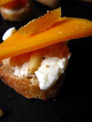 Couvrir d'une tranche de mimolette chaque tartine et finir par une touche de gingembre moulu. Appeler les amis, ouvrir une bouteille de blanc, c'est l'heure de l'apéritif !