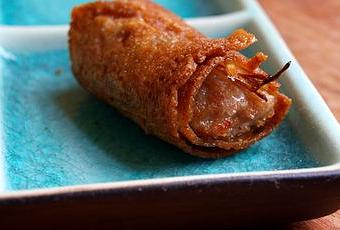 Il suffit de rouler, de fixer le tout avec un cure-dent et de le faire frire 20 secondes dans de l'huile chaude (spécial friture, tant qu'à faire).