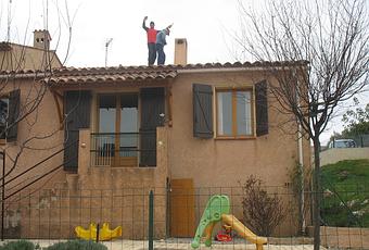 Le Sud de la France ,et plus particulièrement notre région, a été sévèrement touché par la tempête de vent qui a sévi à plus de 150 km/h, les 21 et 22 novembre, à plus de 160km/h selon Luc Quessada que vous verrez en train de réparer son toit avec son voisin Paul Bousquet , quartier de l’Eglisonne , habitutuellement bien venté , alors vous imaginez par temps tempétueux !Toitures endommagées, longues coupures d’électricité samedi 22 11 08 et de nouveau dimanche 23. Voyez un extrait de Var-Matin d’aujourd’hui dimanche 23 : “Scène de désolation , hier matin , sur la commune de Châteaudouble où de nombreuses toitures ont été endommagées, des arbres arrachés…bloquant ainsi la route entre Draguignan et le village . A Ampus , les dégâts étaient nombreux. Le cimetière était saccagé, les plaques en morceaux, les croix brisées. A la chapelle Notre-Dame de Spéluque , un pin a été arraché, tout comme un chêne, un peu plus loin, tombé sur des engins agricoles.”
