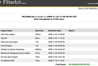 Filterbit est un service gratuit qui vous permet d’analyser vos fichiers simultanément sur plusieurs services antivirus. Sur Filterbit, vous pourrez analyser un fichier suspect qui n’excède pas 20Mb. Il est aussi possible de charger des fichiers compressés.