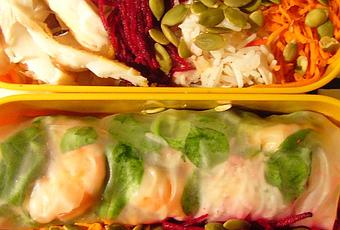 En bas, on retrouve sur un lit de crudité composé de betterave et carotte (encore) un joli rouleau de printemps. Je trouve que la formule rouleau de printemps est un bon moyen de réutiliser les restes. J’ai donc garni ma feuille de riz avec :