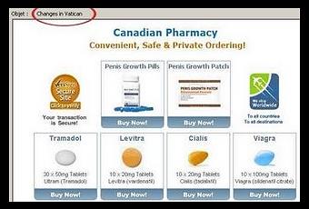 Rolex. J'imagine que les auteurs de ces messages réfléchissent à des sujets susceptibles d'intéresser suffisamment l'homme moyen pour qu'il ouvre le message, si possible dans le monde entier. Et, si possible également, sans se faire attraper par le filtre anti-spam. Cette fois, je dois dire que l'intitulé du message m'a effectivement interpelé (pour les myopes, il s'agit de "changes in Vatican"). Non que je me doutasse du contenu du courrier, ayant des rapports plus qu'épisodiques avec le Vatican, surtout pour des messages reçus vers 3h du matin. Convoquer le Saint Siège pour vendre du cul, ça me semble quand même un procédé pas très catholique.
