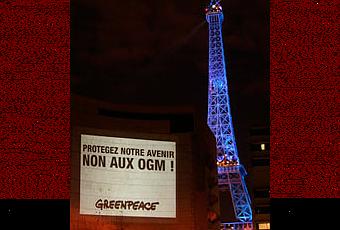 France — Paris, le 26 novembre 2008. Cette nuit, Greenpeace a projeté devant la tour Eiffel habillée des couleurs de l’Europe ce message géant afin de rappeler aux autorités françaises et européennes la nécessité d’obtenir avant la fin de la Présidence française une véritable amélioration des procédures d’évaluation des OGM au niveau européen.