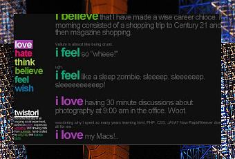 Qu’il est agréable de perdre son temps sur Internet à lire les sentiments de nos amis les humains ! Mieux que le statut de vos amis sur Facebook, souvent totalement rasoir (avouons-le …), Twistori permet de faire défiler les sentiments des utilisateurs de Twitter en temps réel. Enfin pas tous les sentiments mais les principaux : adore, déteste, pense, croit, ressent, espère.