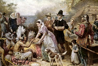 L’hiver était froid et les nouveaux colons n’étaient nullement agriculteurs. Sur les cent deux ayant débarqué sur le sol du Nouveau Monde, la moitié d’entre eux périrent. Or, c’est un Indien de la tribu Wampanoag qui sauva le reste de la communauté. On dit qu’il leur offrit de la nourriture et leur apprit à cultiver du maïs, à chasser et à pêcher. Plus tard, à l’automne, lors de la première récolte, on organisa trois jours de prière et de fête où les colons partagèrent leur repas avec le chef Massasoit et 90 autres Indiens. Il s’agissait de les remercier et d’établir une amitié durable…..