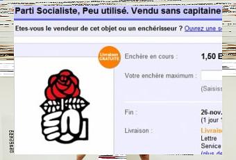 Alors que la lutte fait rage entre Martine et Ségolène, un internaute a mis en vente le Parti Socialiste sur Ebay.fr. L’annonce : « Parti Socialiste, Peu utilisé. Vendu sans capitaine » Attention, la vente se termine le 26 Novembre et les enchères sont déjà montées à 10 millions d’Euros ! Si vous êtes intéressés, faites vite !