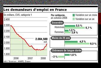 En octobre, 46.900 nouvelles inscriptions ont été enregistrées à l'ANPE (+ 2,4 %), selon les chiffres diffusés hier. Le chômage remonte au niveau de mai 2007, date de l'élection de Nicolas Sarkozy. Le gouvernement va conditionner les aides à l'automobile à des « engagements précis » sur l'emploi.
