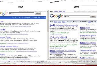 Jérôme : Très marrante et très intéressante expérience qui fait ressortir certaines tendances déjà évoquées par Jean : Les internautes aiment Wikipedia, donc Google affiche de plus en plus de Wikipedia. Regardez par exemple sur la requête love, le site "The Love Calculator" était premier en 2001 et en 2008, il est second, tout juste doublé par Wikipédia (en allant voir le site "The Love Calculator", vous constaterez à quel point ce site est ... nul ... belle prouesse de rester à cette place sur google).