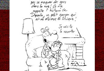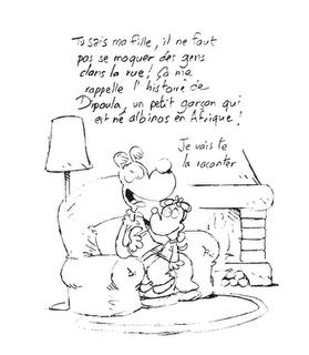 Version plus précise du crayonné. Je ne suis pas encore tout à fait certain du texte que je trouve encore trop moralisateur et direct même si je veux garder l'accent affectif dénoncé, sous forme humoristique, dans l'album. Je retravaillerai donc ce petit texte.Ce dessin a, en fait, été réalisé pour la sortie de l'album "Dipoula" et devrait être mis en ligne sur le blog de Pahé, le dessinateur.