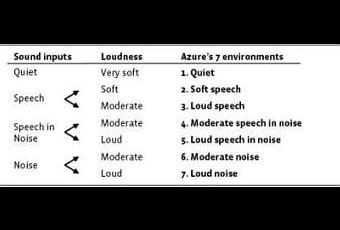 Le succès de l’algorithme « Environmental Optimizer » dépend de la capacité de l’aide auditive à identifier précisément et de façon consistante, c'est à dire sans se tromper, et de caractériser ces environnements avec du sens pour le malentendant. Par exemple, un schéma de classification qui distinguerait différents types de musique pourrait être intéressant mais pas vraiment utile aujourd’hui pour les utilisateurs d’aides auditives en terme d’ajustement automatique dans la vie de tous les jours. Le schéma de classification, développé pour ReSound Azure, prend en considération les facteurs vraiment significatifs pour le malentendant : y a-t-il un son au dessus du niveau ambiant? De la parole est elle présente? Quels sont les niveau sonores présents? Conceptualisée dans la figure 8, cette information est utilisée afin de catégoriser les sons d’entrée dans 7 environnements sonores.