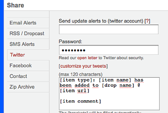 Lorsque vous créez un espace de stockage sur drop.io, il est possible d’y ajouter votre compte Twitter. De cette façon, lorsque vous chargez un nouveau fichier sur drop.io, un message avec le lien pour télécharger le fichier sera automatiquement publié sur votre compte Twitter. La configuration de cette fonction est simple et vous permet de rapidement partager un fichier avec un groupe. N’oubliez pas d’ajouter un mot de passe sur votre espace drop.io si vous y ajoutez les informations de votre compte Twitter.