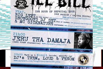 Pour la 1ère fois à Paris ! Date unique en France ! ILL BILL (Non Phixion/ La Coka Nostra) & BIG LEFT de LA COKA NOSTRAFrère du rappeur/producteur Necro, Ill Bill est le fondateur d'Uncle Howie RecordsAncien membre de Non Phixion (avec DJ Eclipse, Goretex et Sabac Red), il est actuellement membre du groupe La Coka Nostra (en compagnie de House Of Pain, Slaine & Big Left).Son nouvel album “The Hour of Reprisal” vient de sortir en Septembre sur Fat Beats.Il sera accompagné sur scène par Big Left, autre membre de La Coka Nostra.Leur 1er passage à Paris s’annonce tout simplement explosif.Plus d’infos sur www.myspace.com/illbill & www.myspace.com/bigleftJERU THA DAMAJA (Gang Star Foundation)Artiste découvert par DJ Premier qui produit ces deux 1ers albums ”The Sun Rises In The East” & ”Wrath Of The Math”, Jeru Tha Damaja est considéré comme un des MCs les plus importants de l’histoire du Hip Hop.Sorti du giron de la Gangstarr Foundation, il a depuis sorti 3 albums dont le dernier ”Still Risin” en 2007.Truffé de morceaux classiques (”Come Clean”, ”D Original”, ”Can’t Stop The Prophet”, ”Me Or The Papes”…) & d’humour, son show est inratable pour tout amateur de Classic Hip Hop.Plus d’infos sur www.myspace.com/jeruDJ ILLEGAL de SNOWGOONSLeader du collectif de producteurs allemands Snowgoons, DJ Illegal sera également de la partie pour un 1er passage à Paris.Après un 1er album ”German Lugers” acclamé par la critique Hip Hop internationale, le nouvel album de Snowgoons “Black Snow” est sorti cette année sur le label Babygrande (Jedi Mind Tricks…).Plus d’infos sur www.myspace.com/snowgoonsLe concert sera suivi d’une soirée avec TREM, LOUD & VENOM, les DJs du crew GOLDEN YEARS OF HIP HOP, qui assureront également l’ouverture du concert.Plus d’infos sur www.myspace.com/thegoldenyearsofhiphopOuverture des portes à 20h, fermeture à 2h.La Bellevilloise – 19/21 rue Boyer – 75019 ParisM° : Gambetta ou MénilmontantInfoline : 0142294897Préventes : 22 euros, frais de location inclus (FNAC & Digitick.com)http://www.digitick.com/ill-bill-big-left-et-jeru-tha-damaja-e-concert-rap-hip-hop-la-bellevilloise-paris-04-decembre-2008-css4-digitick-pg101-ri147417.htmlhttp://www.fnacspectacles.com/place-spectacle/ficheartiste/-Ill-Bill---Big-Left-918fadc2c0a8850b00317809874566fa.htmSur place : 25 euros