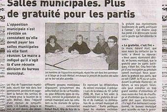 Pourtant, fin novembre 2008, la dernière trouvaille de G. HUET pour brimer l’opposition est de nous faire payer pour l’utilisation des salles de réunions municipales. Cet énième coup bas porté à la démocratie locale est la goutte qui fait déborder le vase. Le maire s’assoit sur le vote unanime du 10 juillet et nous devrons maintenant payer chaque mois pour faire nos réunions de préparation du Conseil, nos réunions de sympathisants ou autres. Nous avons d’ailleurs déjà reçu un contrat de location de salle pour une réunion du 1er décembre. Par contrainte, nous l’avons signé, mais nous protestons vivement contre le principe.