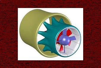Prenez ce modèle de turbine carénée comme un réacteur à double flux, il reçoit et canalise l'air en deux flux, un qui passe dans la turbine, et le flux périphérique qui contourne l'engin et vient se rejoindre en arrière, pour former un vortex puissant qui a un rôle aspirant pour améliorer le rendement.