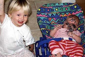 Je devrais pas rire à la vue de ce petit visage tout machuré de feutre, c'est mal, surtout qu'on sent dans la crispation des avants-bras et les marques sur les mains qu'il a essayé de se défendre.J'aimerais tellement pas être à la place de cette maman qui va devoir demander sur un forum féminin si quelqu'un connaît une astuce pour enlever des traces de marqueur ...sur le visage d'un bébé!!