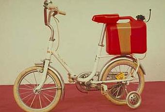 The jerry can is filled with gas; if one rides the tricycle, the match burns