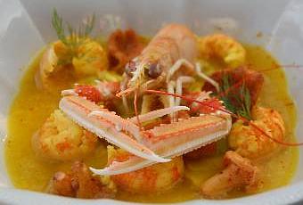 La langoustine, crustacée de toutes les fêtes, nage dans un bouillon parfumé au safran et au céleri branche. Les ravioles de Romans apportent de l'onctuosité au palais.