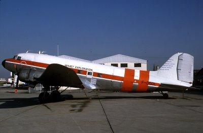 (photo collection privée Jacque Guillem)Je vous ai montré il y a quelque temps, une photo du DC3 F-ODQL (F-GILV) en cours de restauration au Malta Museum Aviation, le voici sur le tarmac du Bourget en 1986. sous les couleurs d' HEMET EXPLORATION qui l'avait acheté à AIR CAPE (Afrique du Sud). C'est une photo que son auteur, Jacques Guillem , a eu la gentillesse de m'envoyer avec quelques autres photos de ce DC3 du temps ou il volait sous immatriculation Française (F-GILV et F-ODQL).