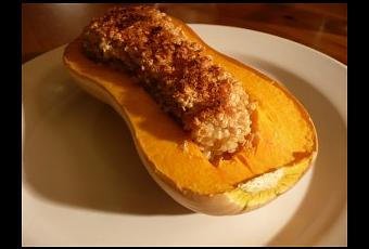 Remplir chaque moitié de courge de quinoa, saupoudrer de la dernière cuillerée de levure de bière et saler.