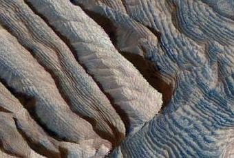 Nous sommes sur Mars, dans la région d’Arabia Terra, près de l’équateur. La sonde spatiale Mars Reconnaissance Orbiter y a observée des sols où apparaissent différentes couches sédimentaires. Un spectacle inattendu pour les astronomes, qui témoigne de changements climatiques répétitifs. Les roches sédimentaires sont épaisses par endroit de plus de 10 m. et apparaissent à un rythme régulier, plusieurs séries de 10 terrasses. Des changements climatiques expliqués par les basculements de l’axe de rotation de la planète, variant de quelques dizaines de degrés tous les 100 000 ans. Ainsi, ce serait environ 12 millions d’années qui sont lisibles dans ces reliefs à ciel ouvert, offerts aux yeux de la caméra stéréo de ce vaisseau. Reste à savoir comment toutes ces terrasses se sont-elles formées ? Et quand cela a t’il eu lieu ? D’autres questions attendent encore les chercheurs sur le passé mouvementé de cette planète.