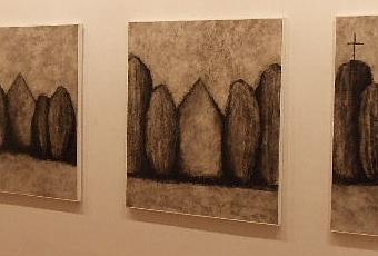 Tout d’abord, ceux de Loïc Le Groumellec à la Galerie Templon (jusqu’au 31 décembre). Il peint le même motif depuis si longtemps, menhirs, maisons, mégalithes parfois christianisés, surmontés d’une croix, qu’on reconnait aussitôt ses tableaux, leur force et leur unicité. Le motif ne compte plus guère : opposition entre monde païen et christianisme, racines celtes.