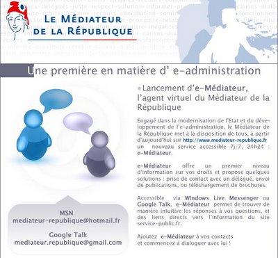 Nous avons eu la chance d'être retenus par Mr Jean Paul Delevoye, Médiateur de la République, pour l'aider à mettre en place un "E-médiateur". Cet outil conversationnel, en ligne depuis la semaine dernière, est un projet passionnant, et surtout d'utilité publique : Donner un accès au droit pour le plus grand nombre ! Vous pouvez tester cet outil, qui a la particularité d'être "multi-protocoles", et surtout très simple à prendre en main ! Ce "e-médiateur" est capable de travailler sur les aspects sémantiques, mais aussi en mode "menu", il peut envoyer des mails à l'internaute avec pièces jointes, et permet le téléchargement de documents... Et ce n'est qu'un début !!!