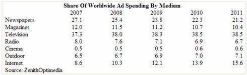 Comme certains médias reculent, la pub en ligne passerait de 10,3% en 2008 à 15,6% en 2011 des investissements publicitaires au niveau mondial.