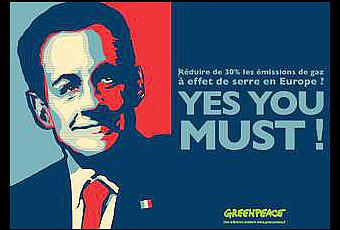 Dans ce cas-ci, en reprenant le visuel des posters d’espoir (”Yes, we can”) très populaires de Barack Obama, Greenpeace rappelle à Nicolas Sarkozy ses promesses électorales en matière d’environnement consistant à 1) réduire de 30% les émissions de gaz à effet de serre en Europe et 2) faire payer les entreprises qui polluent.