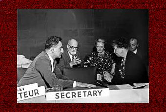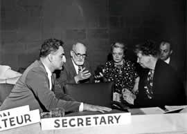 Trois membres de la Commission des droits de l’homme des Nations Unies discutent avant la poursuite d’une réunion sur le projet de pacte sur les droits de l’homme. De gauche à droite : le Dr. Charles Malik (Liban), le Professeur René Cassin (France), et Mme Eleanor Roosevelt (Etats-Unis). © Photo ONULe 10 décembre 1948, les 58 Etats Membres qui constituaient alors l’Assemblée générale ont adopté la Déclaration universelle des droits de l’homme à Paris au Palais de Chaillot. Pour commémorer son adoption, la Journée des droits de l'homme est célébrée chaque année le 10 décembre. A cette occasion, Amnesty International s'associe à la ville de Val-de-Reuil. Les membres d'Amnesty interviendront dès 14h 30 notamment auprès des jeunes à la médiathèque.