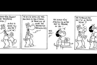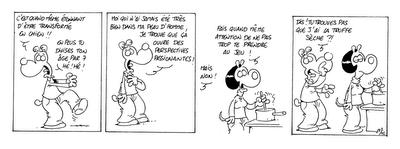 J'ai l'impression d'arriver à un moment un peu charnière de l'album - réalisé de façon un peu empirique jusque là (dans le sens "ça vient un peu comme ça vient"), je me repenche maintenant sur la construction d'ensemble du livre. 50 strips à venir c'est à la fois peu et beaucoup. Il va me falloir réfléchir un peu plus à la finalité de l'album - tout ça pour vous dire que je me suis, du coup, repenché sur les premiers strips et, voulant renforcer le côté "passage d'homme à chien", j'ai ajouté le strip que je mets en ligne aujourd'hui ! Ce serait en fait le strip 3 du livre ! CQFD