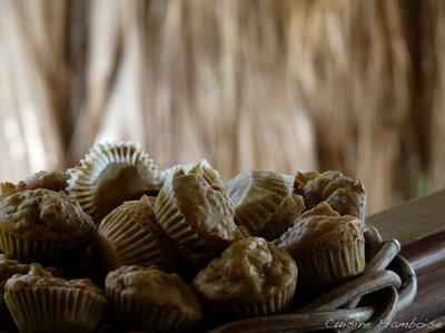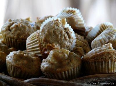 Elle proposait de jolis muffins aux pommes et flocons d'avoine. Je les ai faits en changeant trois fois rien (du sucre de canne au lieu du sirop d'agave et du coup ,un peu de lait de soja pour humidifier l'ensemble). La Puce a adoré. J'ai recommencé dans un moules à muffin plus grand, c'était un peu plus sec mais quand même bien plaisant.