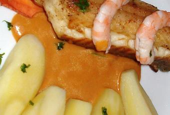 2 belles saumonette, (sans la peau), coupé en 4 tronçons égaux (ne prenez pas les queux, trop filandreuse, garder les pour autre chose), un peut de farine, 8 crevettes décortiqué (pour la déco), 100gr de beurre, une petite boîte de bisque de homard, 10cl de crème liquide, sel et poivre. Fariner, saler poivrer vos tronçons de saumonette, faite les revenir à la poêle au beurre, 5mn de chaque côté, en les arrosant avec le beurre de cuisson constamment, en même temps faire chauffer la bisque de homard et la crémer réserver. Dresser vos assiettes, accompagner d'un légume de votre choix.